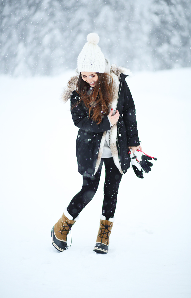 • With leggings or joggers: Stick to slim bottoms to offset the bulk of snow boots.